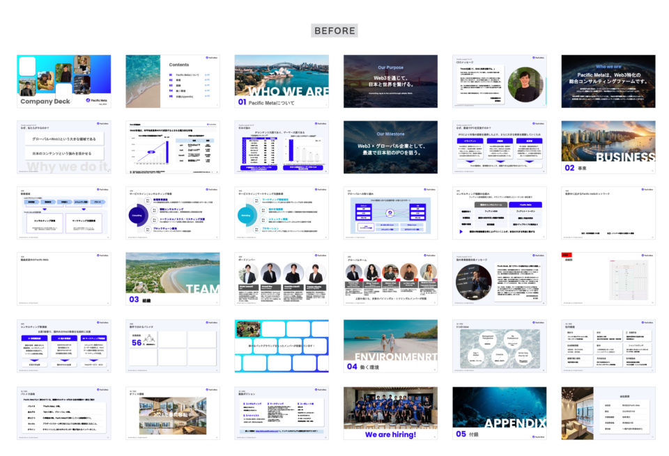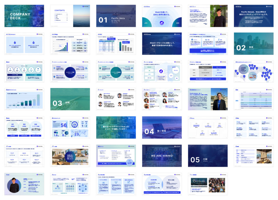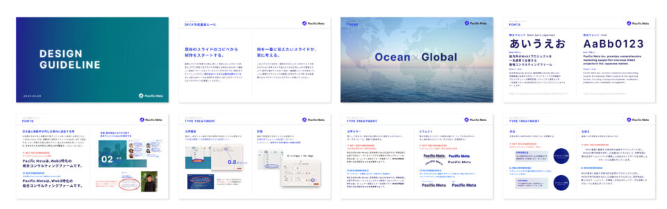 このたび、株式会社Pacific Meta様のカンパニーデック(会社紹介資料)のデザインと、それに伴うビジュアルガイドラインの制作を担当させていただきました。