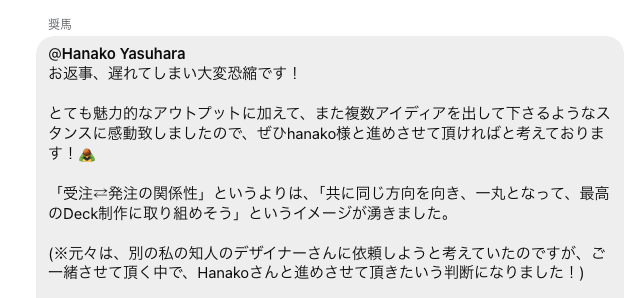 とても魅力的なアウトプットに加えて、複数アイディアを出してくださるスタンスに感動しました。「受注⇄発注」というより、「同じ方向を向いて一丸となって進められるチーム」だと感じました。